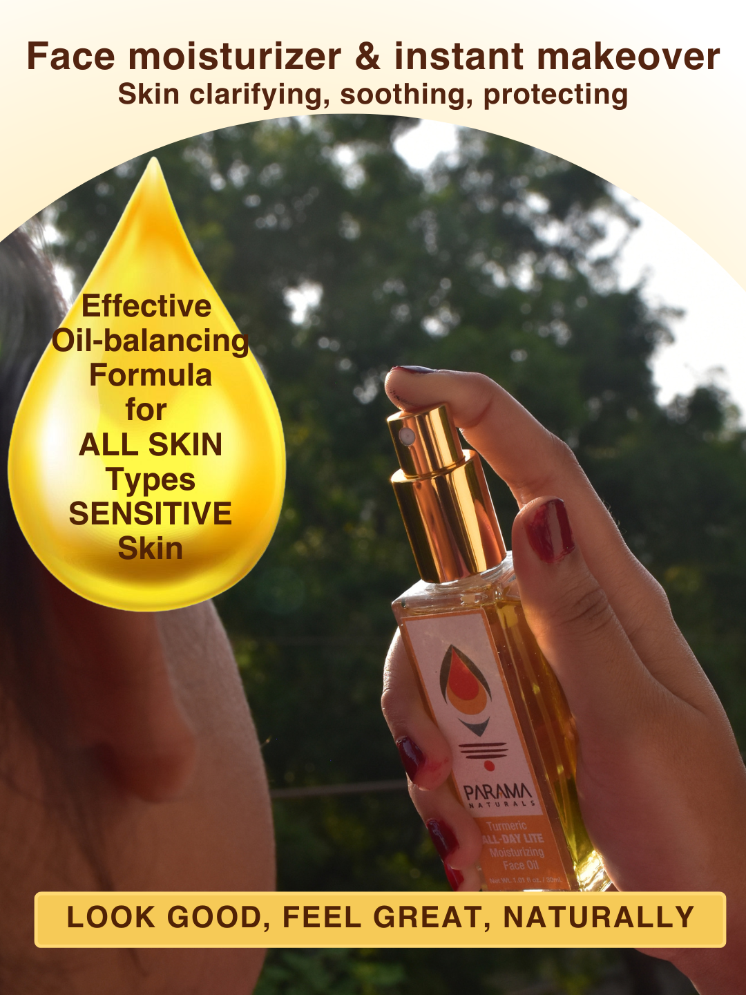 The Turmeric All Day Lite Face Oil is a lightweight and nourishing oil that provides multiple benefits for your skin. The turmeric extract has skin clarifying, toning and oil balancing properties.