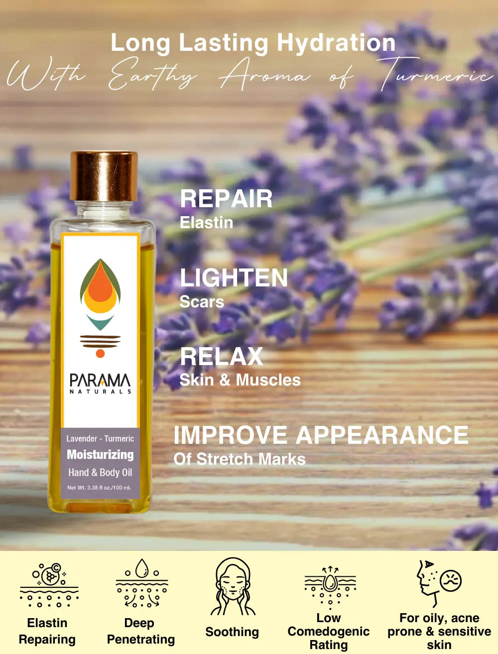 Lavender MOISTURIZING Hand & Body Oil (100 ml):  Moisturizes, soothes, tones, for problem-free skin, with mood- uplifting Lavender. Use it post-bath on moist skin as a leave-on moisturizer, or a full body abhyanga before bath, and/or application on face and body before sleep to get benefits of Abhyanga and Aromatherapy.