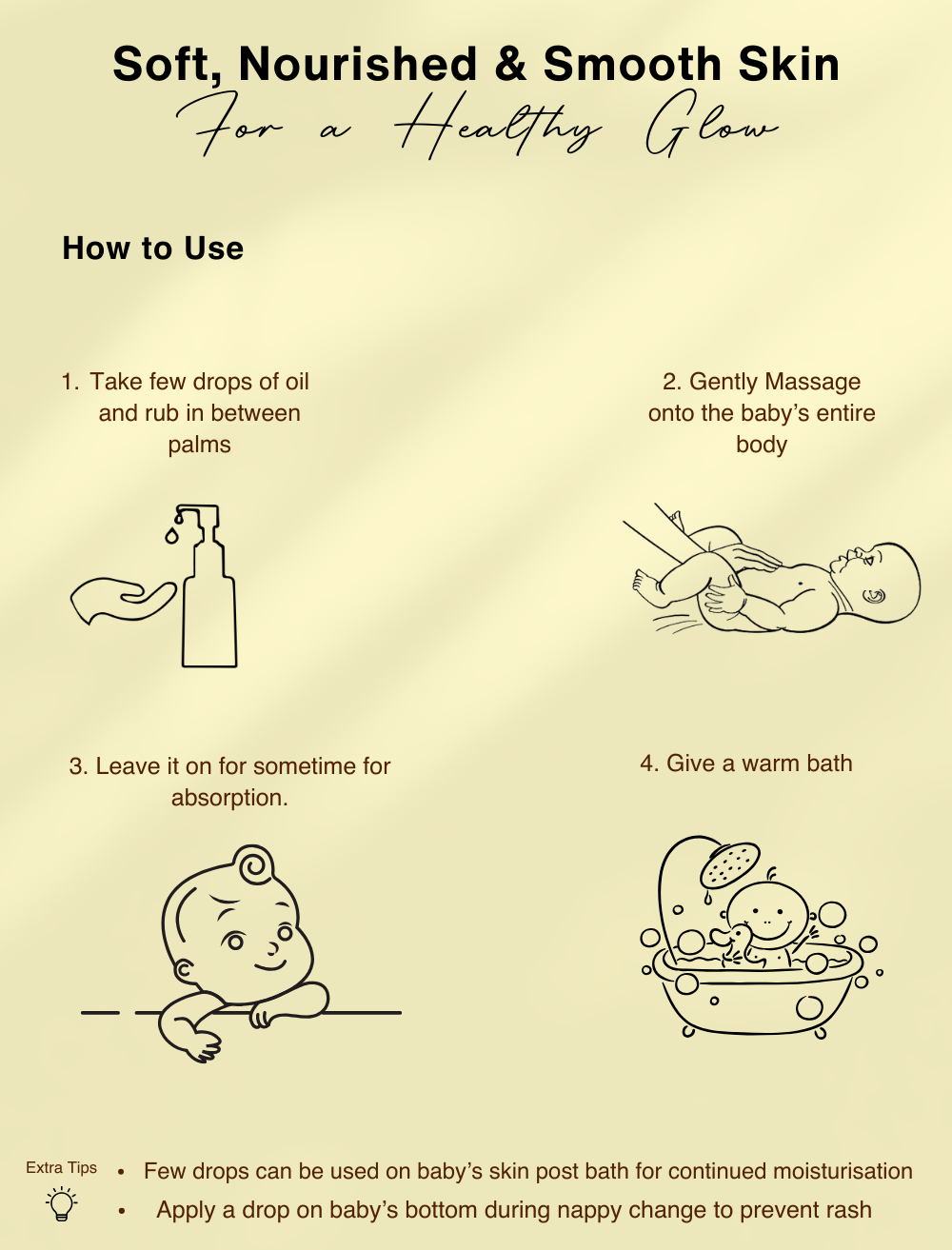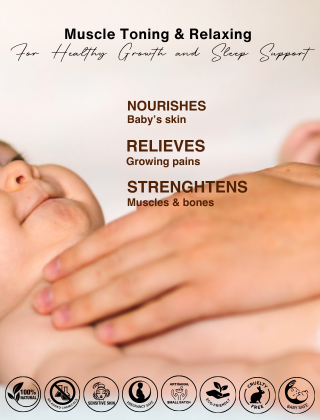 Experience the age-old and time-tested tradition of daily oil massage for your newborn. Crafted with care, this oil not only strengthens the precious bond between mother and baby but is also a vital element in the baby's physical development. Following Ayurvedic principles, the oil is infused with the goodness of 100% pure extract of Turmeric, creating a perfect blend of cold-pressed Sesame, Coconut, and Almond oils. This balanced formulation, suitable for babies across all seasons, promotes the healthy development of muscles, bones, and skin. Hypoallergenic and free from additives, perfumes, or preservatives, it is the ideal choice for delicate baby skin.