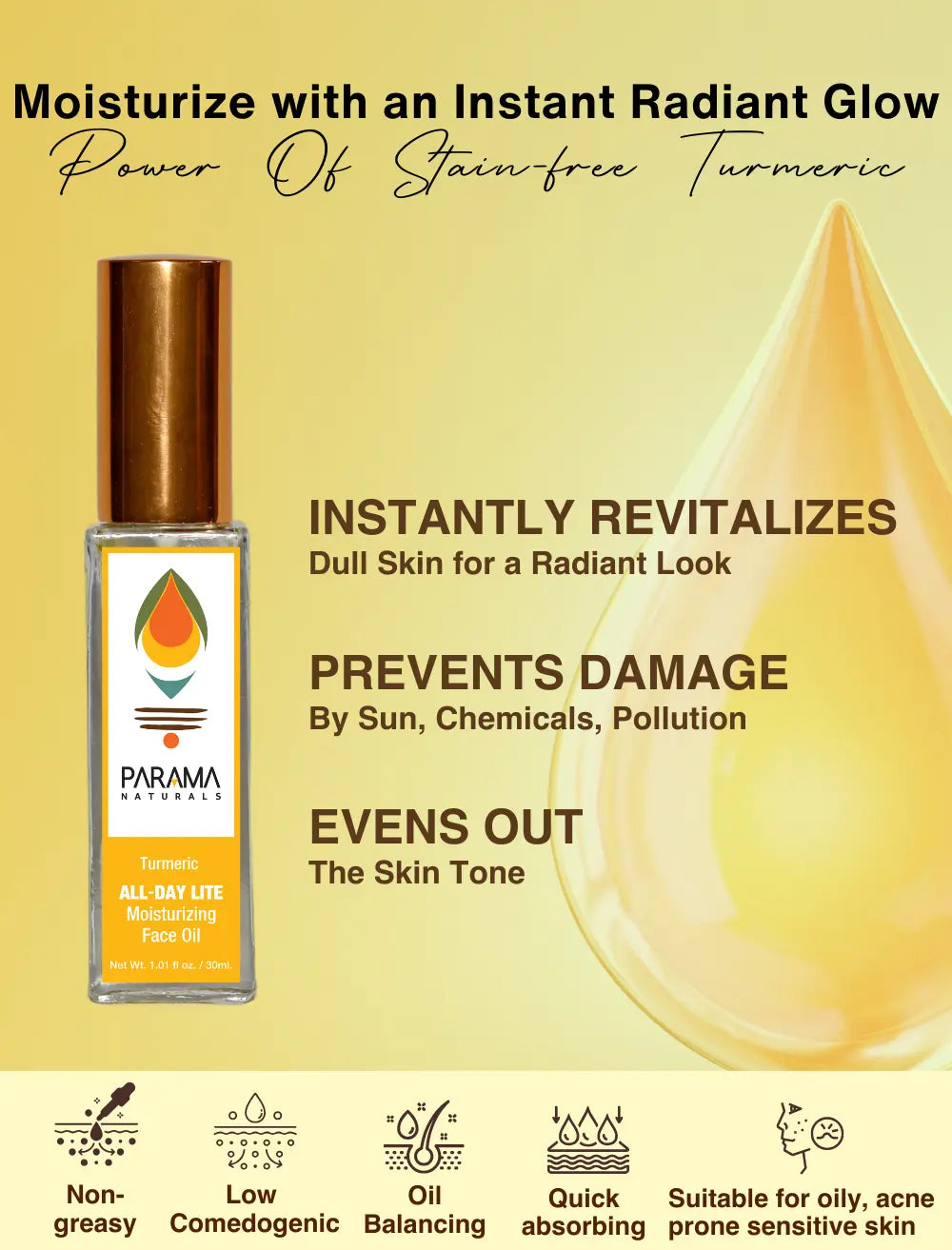 Turmeric ALL-DAY LITE Moisturizing Face Oil (30ml): Moisturizes, gives an instant glow, even skin tone, soothes, protects against environmental damage and early aging.