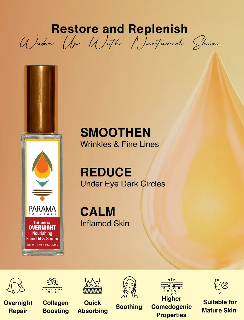 Turmeric OVERNIGHT Nourishing Face Oil & Serum (30ml): Refreshes, clarifies and tones the skin, leaving it luminous, while elevating your mood. Perfect for all.