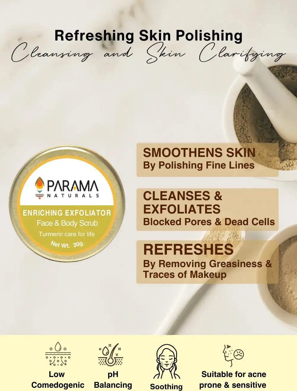 ENRICHING EXFOLIATOR Face & Body Scrub (10g): A herbal cleanser which nourishes, refreshes, and smooths skin while polishing, exfoliating and reducing skin impurities.