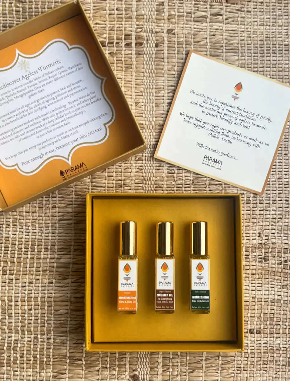 Turmeric Moisturizing Hand & Body Oil (Haridra Tailam): Cold-pressed, Sesame Oil (Sesamum indicum), Virgin Cold-pressed (Cocos nucifera), Cold-pressed Almond Oil (Prunus amygdalus), Turmeric Essential Oil (Curcuma longa CO2 extract)