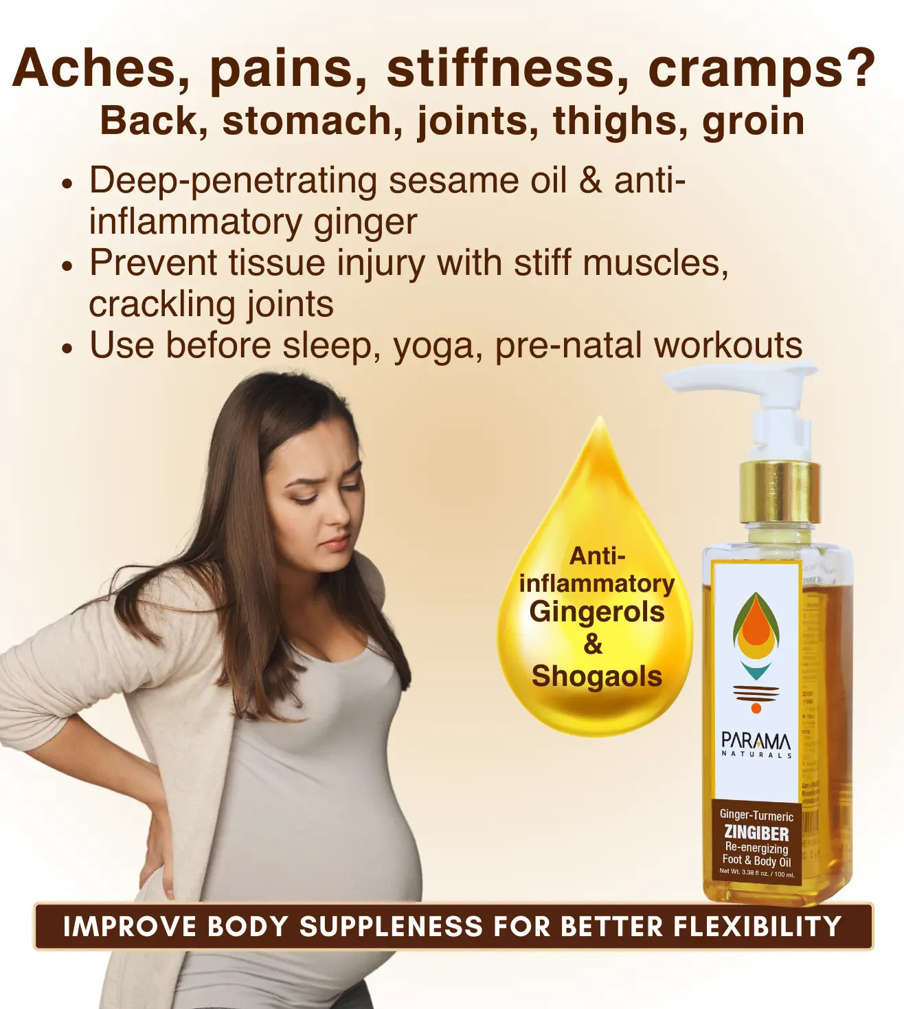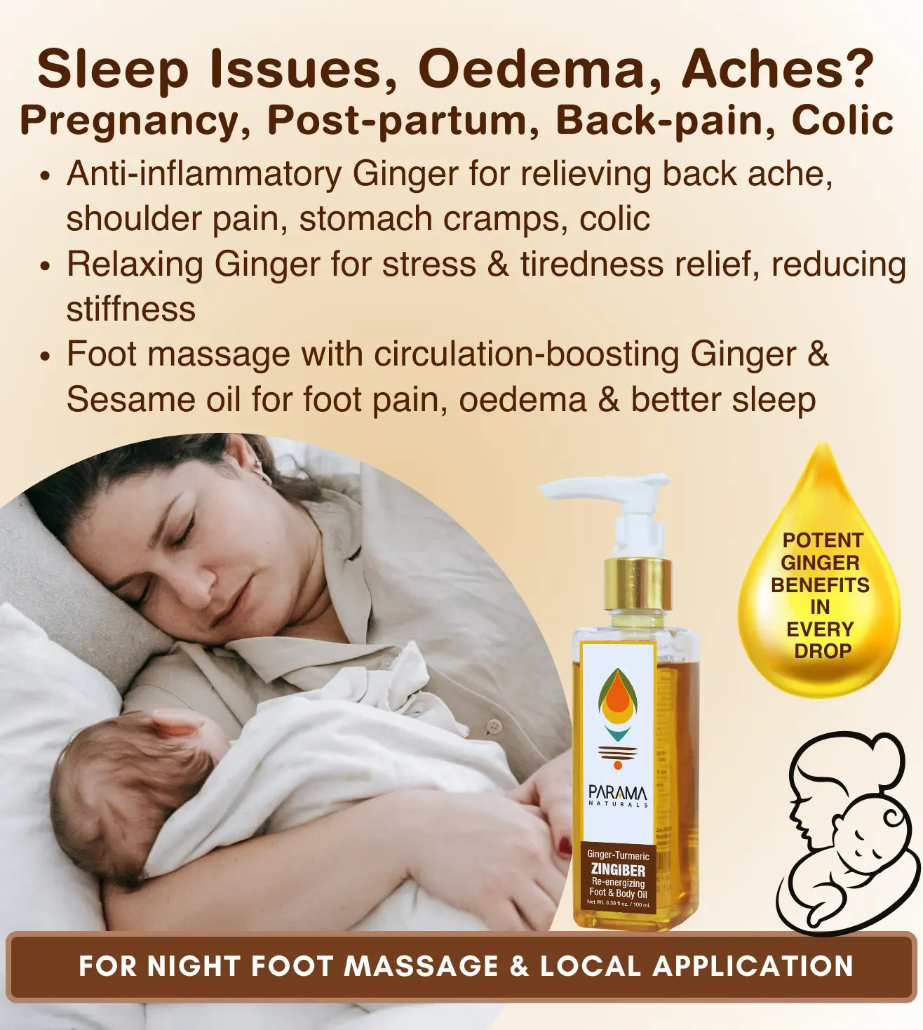 Zingiber Body Oil (100ml) : Enjoy foot and back massages during pregnancy and postpartum for relaxation and tiredness relief. Especially suited for foot edema, cramps and bloating during pregnancy. Ideal for re-energizing after sleepless nights, providing comfort for shoulders and back.