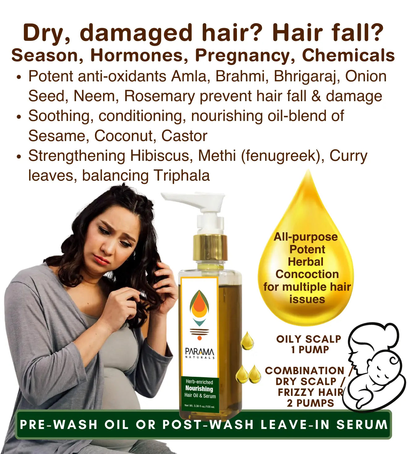 Nourishing Hair Oil & Serum (100ml) : Promote healthy hair growth and foster relaxed sleep with our herb enriched luxurious hair oil. Maintain their strength and vitality during both pregnancy and the postpartum phase with use as a pre-wash conditioner or as a post-wash leave-in serum.