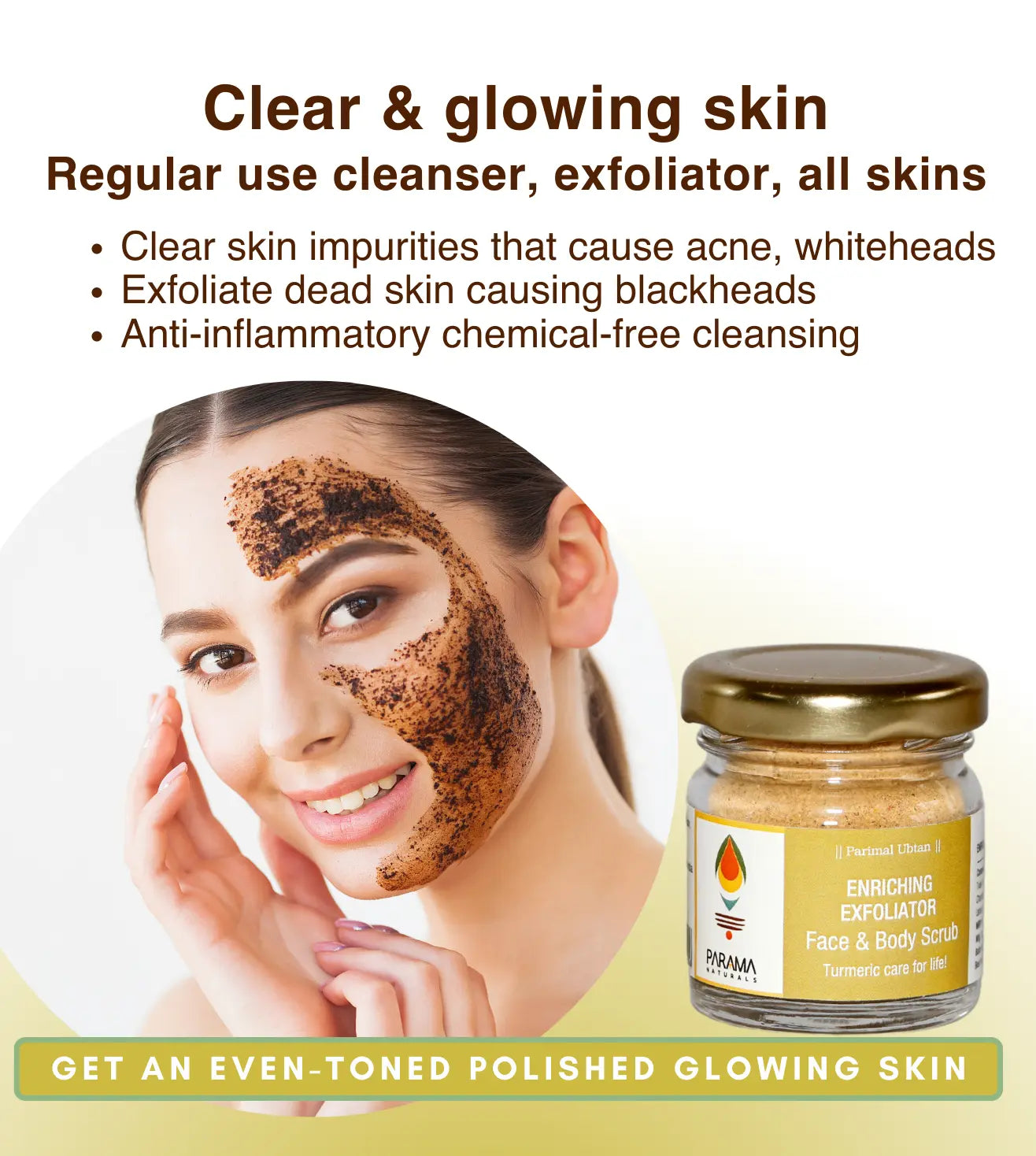 Enriching Exfoliator Face & Body Scrub (10g) : For soap-free gentle cleansing or exfoliation with benefits of Haldi-Chandan Ubtan, to prevent accumulation of dead skin and impurities, and rejuvenate dull and lifeless skin. It can also be used as a face pack mixed with rosewater.