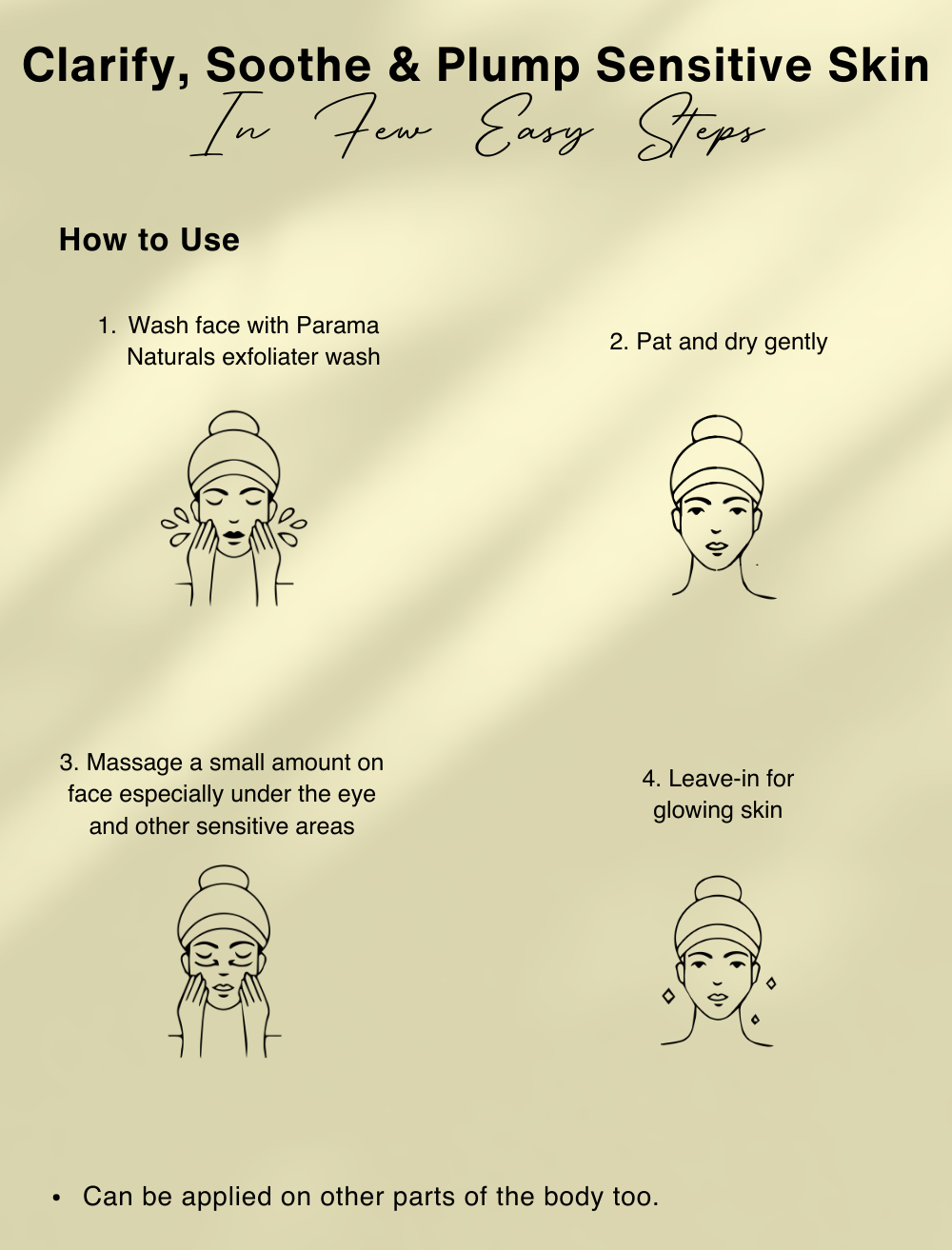 - Begin with a thorough cleansing using Parama Naturals Exfoliator scrub.