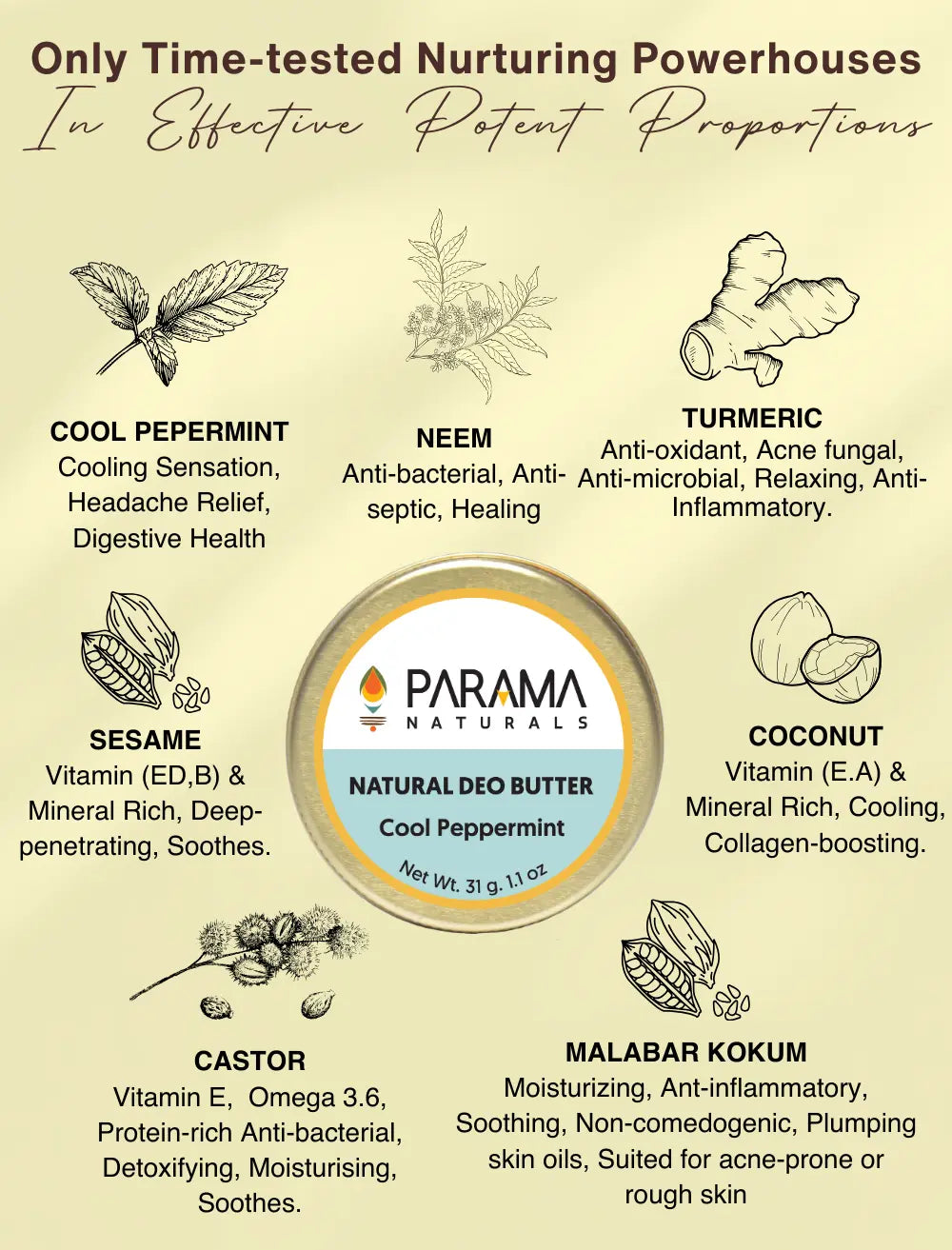 Parama Naturals Cool Peppermint Deodorant Contains Ingredients Known For Their Antimicrobial Properties, Such As Peppermint And Neem Oil, Which Help Control Sweat And Neutralize Odor-Causing Bacteria. The Deodorant Is Free From Harmful Chemicals Like Aluminium, Parabens, And Synthetic Fragrances, Making It A Safe And Skin-Friendly Choice For Daily Use.