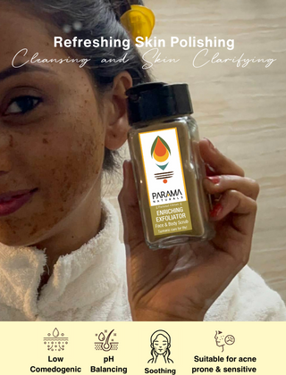 2. For dry to combination skin - Mix a required amount of scrub in Parama Moisturising Face & Body Oil or any Carrier Oil of your choice, apply on the face and neck in circular motion and all over the body. Rinse with warm water.