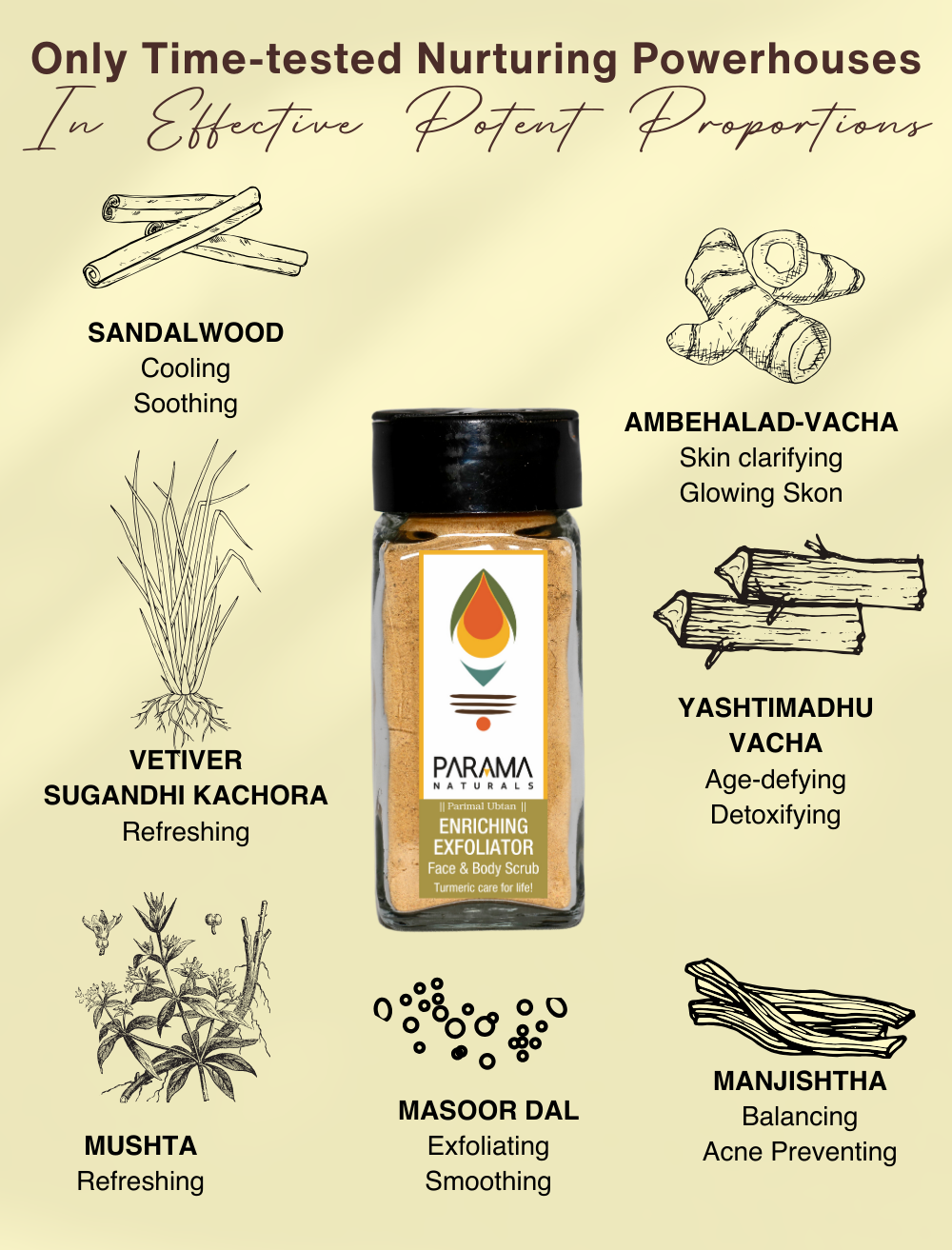 Enriching Exfoliator Face & Body Scrub: Manjishtha (Rubia cordifolia), Arjuna Tvak (Terminalia arjuna), Vacha (Acorus calamus), Yashtimadhu (Glycyrrhiza glabra), Ambehalad (Curcuma aromatica), Chandan (Santalum album), Sugandhi Kachora (Curcuma zeodaria), Mushta (Cyperus rotundus), Ushira (Vetiveria zizanioides), Masoor (Lens culinaris) AND NOTHING ELSE. No added chemicals, preservatives, colours, fragrance. No mineral oil. Only the healing power of plants!