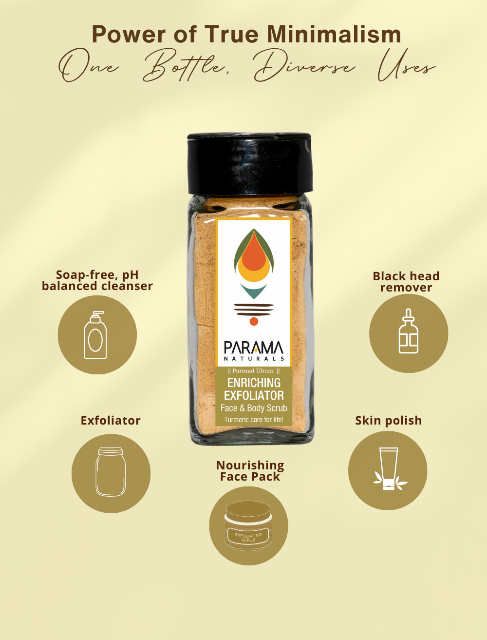 - For dry skin, use it with Parama Natural’s Moisturising Face & Body Oil. (Refer to the instructions for usage)
