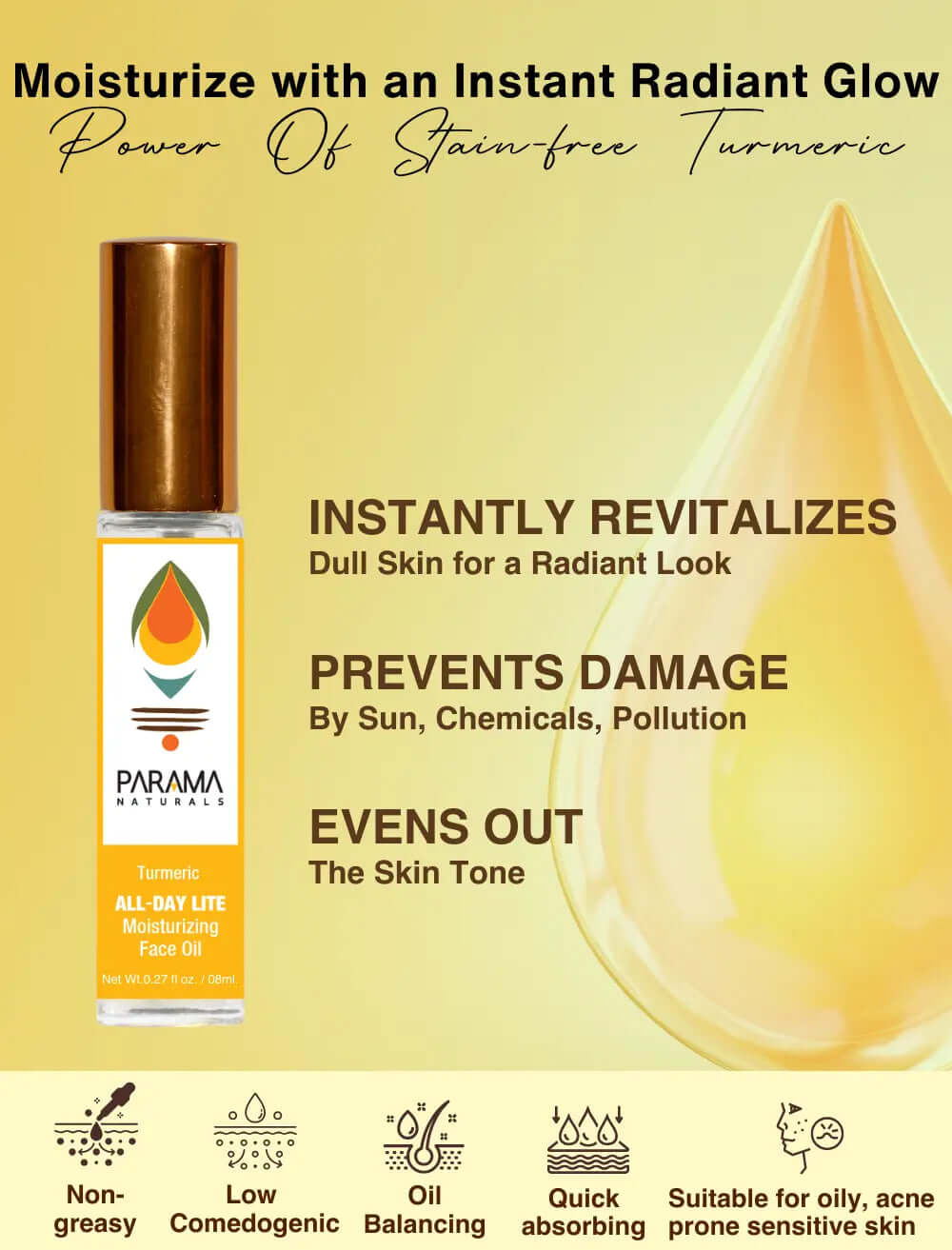 Turmeric ALL-DAY LITE Moisturizing Face Oil (8ml): Moisturizes, gives an instant glow, even skin tone, soothes, protects against environmental damage and early aging.