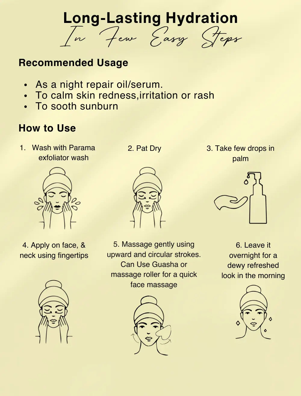 - Use circular motions to apply 3-4 drops of Facial Oil to your face and neck.