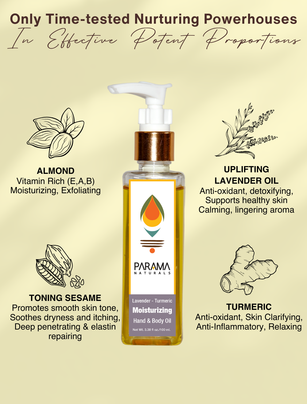 - The Lavender MOISTURIZING Hand & Body Oil has a higher proportion of sesame oil, which is better for long-lasting moisturising, and also for improved natural sun-screening properties which augment those of turmeric. The sesame oil is also deeper penetrating and has elastin-repairing properties, which work at deeper issues like scars and marks.