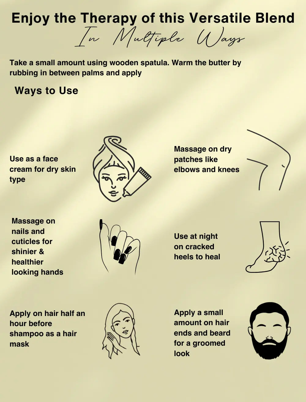 - For Nails: Massage a small amount of multipurpose butter onto nails and cuticles, allowing it to absorb few minutes to nourish and promote overall nail health.