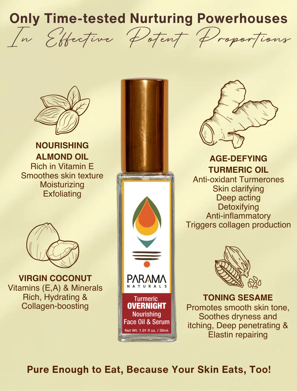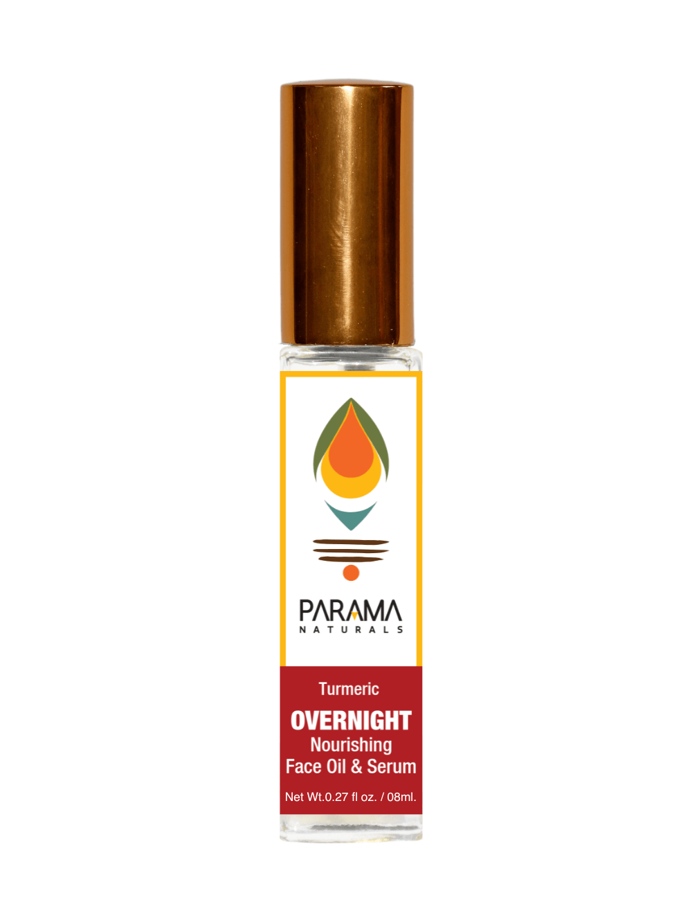Age-defying and collagen boosting - Parama Naturals’ Face oil and Serum (two in one) has the potent turmerone-rich turmeric extract. It penetrates deep into the skin layers and along with coconut oil, it helps trigger collagen production, rejuvenate the cells and delay signs of aging like wrinkles, fine lines and sagging skin. Feel the calming effects of turmeric as it seeps into your skin. Best used at night on freshly cleansed face.