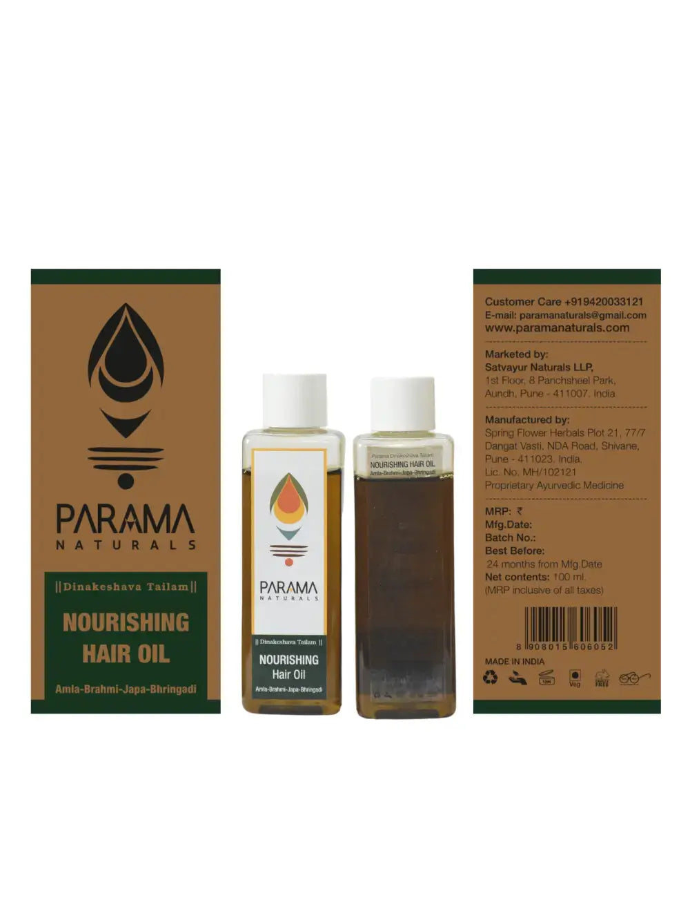 Nourishing Hair Oil (Dinakeshava Tailam): Cold-pressed Sesame Oil (Sesamum indicum), Virgin Cold-pressed Coconut Oil (Cocos nucifera), Cold-pressed Castor Oil (Ricinus communis), Onion Seed Oil (Nigella sativa), Hibiscus Extract (Rosa sinensis), Indian Gooseberry Extract (Emblica officinalis), Water Hyssop Extract (Bacopa monnieri), Curry Leaf Extract (Muraya koenigii), Rosemary Essential Oil (Salvia rosmarinus), Fenugreek Extract (Trigonella foenum graecum), Neem Oil (Azadirachta indica), Turmeric Essential Oil (Curcuma longa CO2 extract) AND NOTHING ELSE.