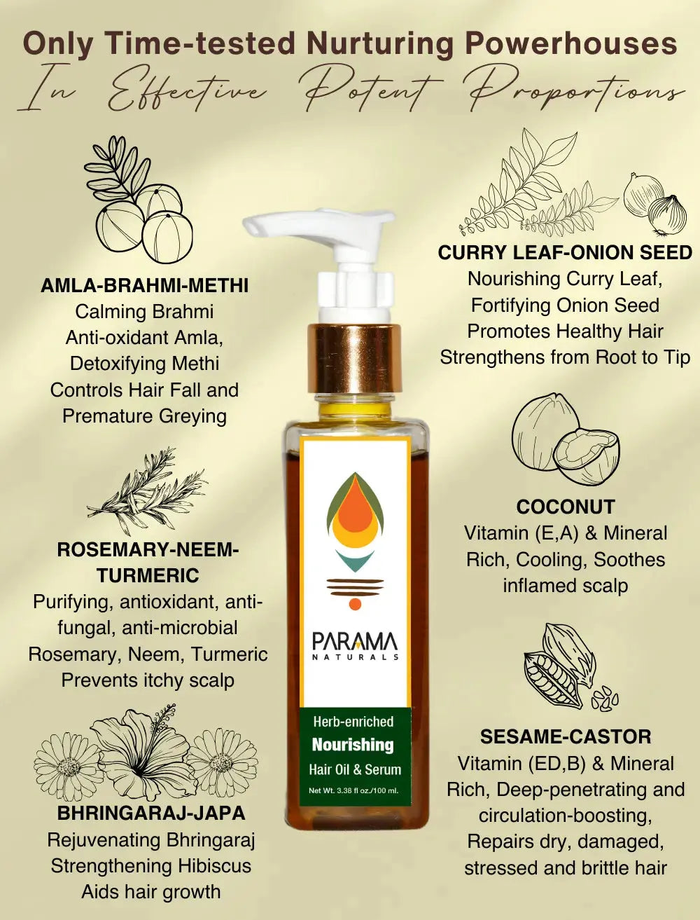 A potent herb-enriched Nourishing Hair Oil and Hair Serum with amla, brahmi, bhringaraj, curry leaves, neem, hibiscus and turmeric extracts. Ideal for pre-wash application in the roots for hair nourishing, hair conditioning, hair fall, and dandruff prevention, and reducing premature graying of hair, stress relief, sleep support. Suitable for all ages, all hair types.