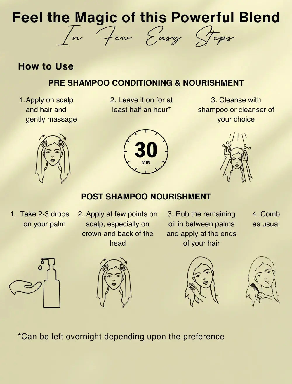 Ingredients used in the Nourishing Hair Oil and their benefits Anti-oxidant-rich Amla and balancing Triphala - Prevents premature greying - Reduces hair fall Calming Brahmi - Reduces stress and anxiety - Reduces hair breakage and fall Nourishing Curry leaf and Onion Seeds - Strengthening from hair follicles to tip - Promotes healthy hair Rejuvenating Bhringaraj and Hibiscus - Aids hair growth - Prevents premature greying Purifying and anti-fungal Turmeric, Rosemary and Neem - Reduces scalp itchiness and dandruff - Soothes inflamed scalp Deep-penetrating and circulation-boosting Sesame Oil - Stimulates and improves blood circulation - Repairs dry, damaged, stressed and brittle hair Cooling Coconut - Detangles and conditions - Makes frizzy hair manageable Detoxifying Methi - Dandruff control - Hair fall reductionPre-Wash Scalp Treatment: