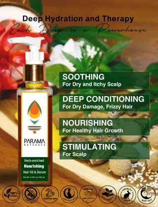 Nourish and support hair growth - Herb-enriched with nutrients like Amla, Brahmi, Bhringaraj, Hibiscus (Japa), Fenugreek (Methi), Curry leaves, which are known to make hair stronger and shinier and provide nutrition to the scalp. Best used overnight pre-wash or as post-wash leave-in serum and conditioner.