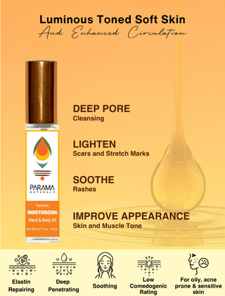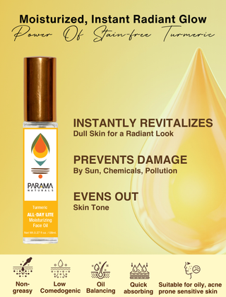 - The MOISTURISING and the LITE oils are well suited for acne-prone skin. The anti-oxidants and anti-bacterials in turmeric and the cold pressed oils of coconut, sesame and almond help prevent and also dry up the acne. They also work on preventing removing the acne scars that get created.