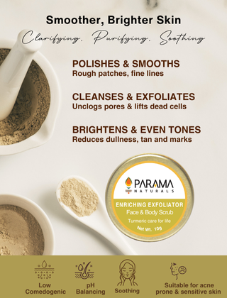 - Enriching Exfoliator (Face & Body Scrub) – Use as a gentle cleanser or nourishing mask to polish, smoothen, brighten.
