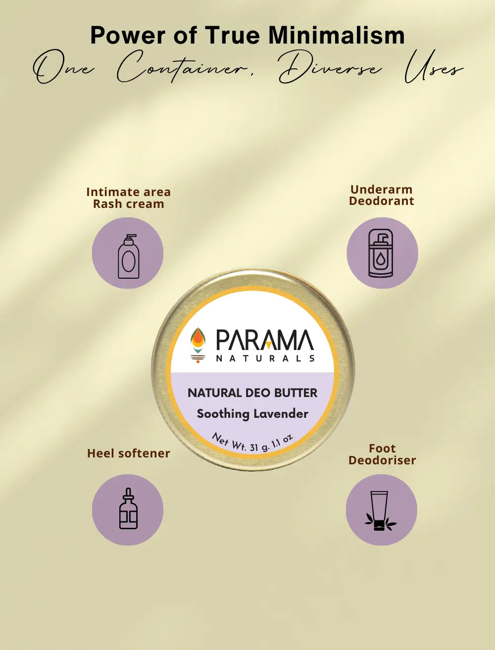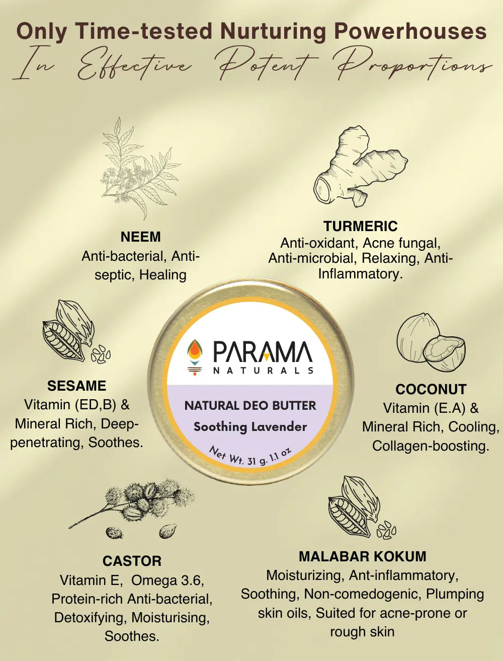 Parama naturals Soothing Lavender Deodorant provides natural and effective odor protection. It contains ingredients known for their antimicrobial properties, such as lavender Extract and Neem oil, which help control sweat and neutralize odor-causing bacteria. The deodorant is free from harmful chemicals like aluminium, parabens, and synthetic fragrance, making it a safe and skin-friendly choice for daily use.